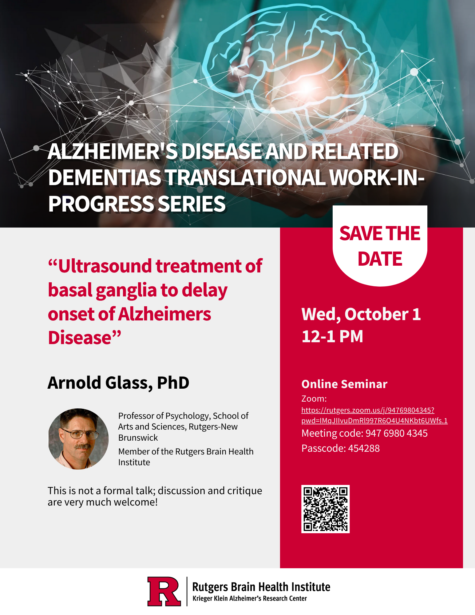 “Ultrasound treatment of basal ganglia to delay onset of Alzheimer's Disease” Arnold Glass, PhD Professor of Psychology, School of Arts and Sciences, Rutgers-New Brunswick Member of the Rutgers Brain Health Institute This is not a formal talk; discussion and critique are very much welcome! Date and Time: Wednesday, October 1, 12 – 1 PM Zoom: […]