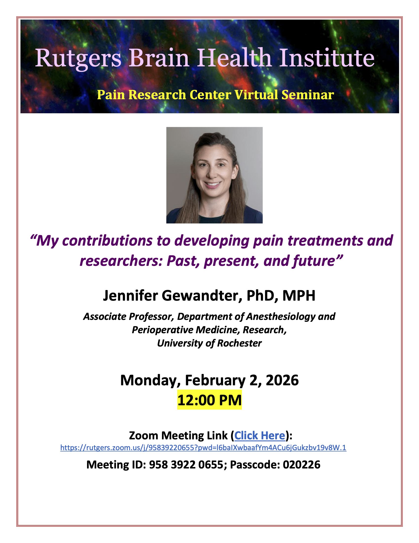 “My contributions to developing pain treatments and researchers: Past, present, and future” Speaker: Jennifer Gewandter, PhD, MPH Associate Professor, Department of Anesthesiology and Perioperative Medicine, Research, University of Rochester Date and Time: Monday, February 2, 2026, 12:00 PM Zoom Meeting: https://rutgers.zoom.us/j/95839220655?pwd=l6baIXwbaafYm4ACu6jGukzbv19v8W.1 Meeting ID: 958 3922 0655; Passcode: 020226 |
