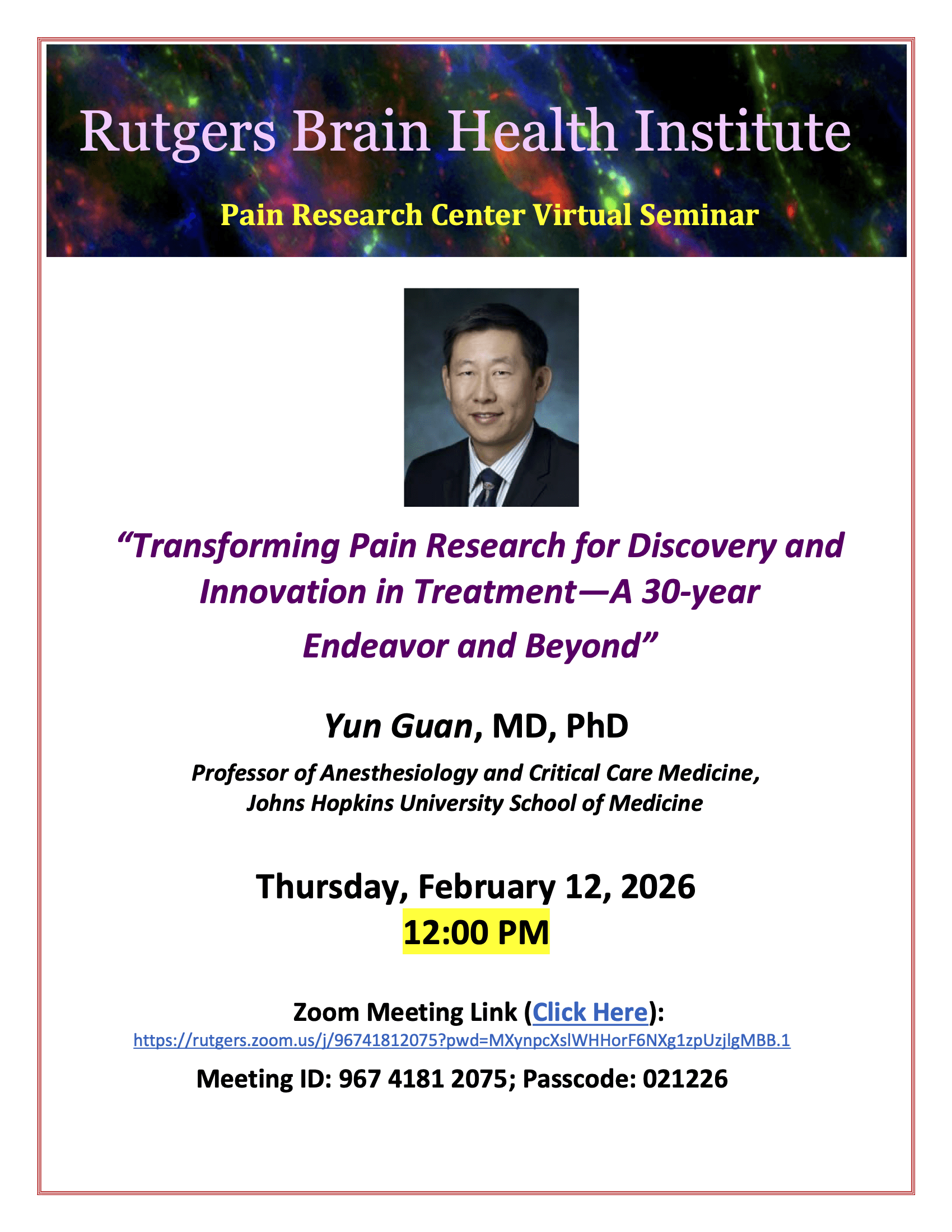 “Transforming Pain Research for Discovery and Innovation in Treatment—A 30-year Endeavor and Beyond” Speaker: Yun Guan, MD, PhD Professor of Anesthesiology and Critical Care Medicine, Johns Hopkins University School of Medicine Date and Time: Thursday, February 12, 2026, 12:00 PM Zoom Meeting: https://rutgers.zoom.us/j/96741812075?pwd=MXynpcXslWHHorF6NXg1zpUzjlgMBB.1 Meeting ID: 967 4181 2075; Passcode: 021226 |