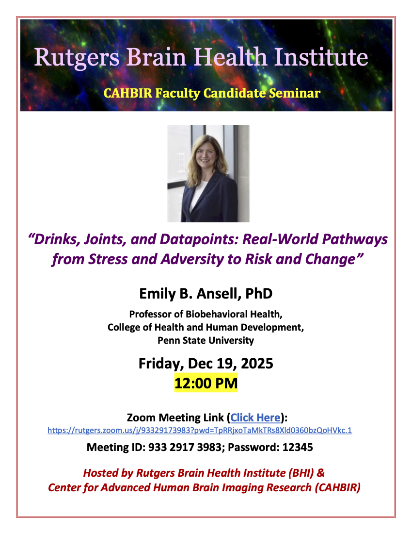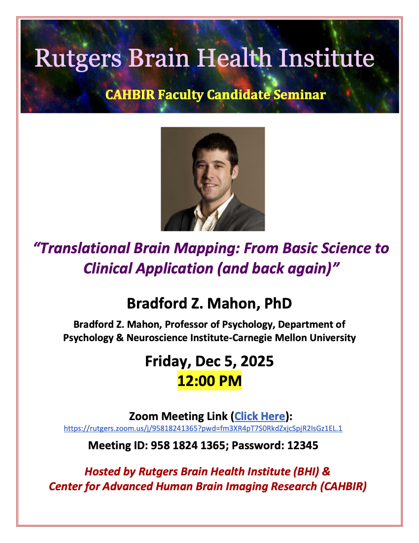 “A Neural Computational Pathway Underlying Face Perception” Speaker: Runnan Cao, PhD Instructor, Department of Radiology, Washington University in St. Louis, St. Louis, MO Date and Time: Monday, Dec 1, 2025, 12:00 PM Join Zoom Meeting: https://rutgers.zoom.us/j/94089898806?pwd=vqgiBhRB0uhBQStbdINUIjegewMYpV.1 Meeting ID: 940 8989 8806 | Password: 12345