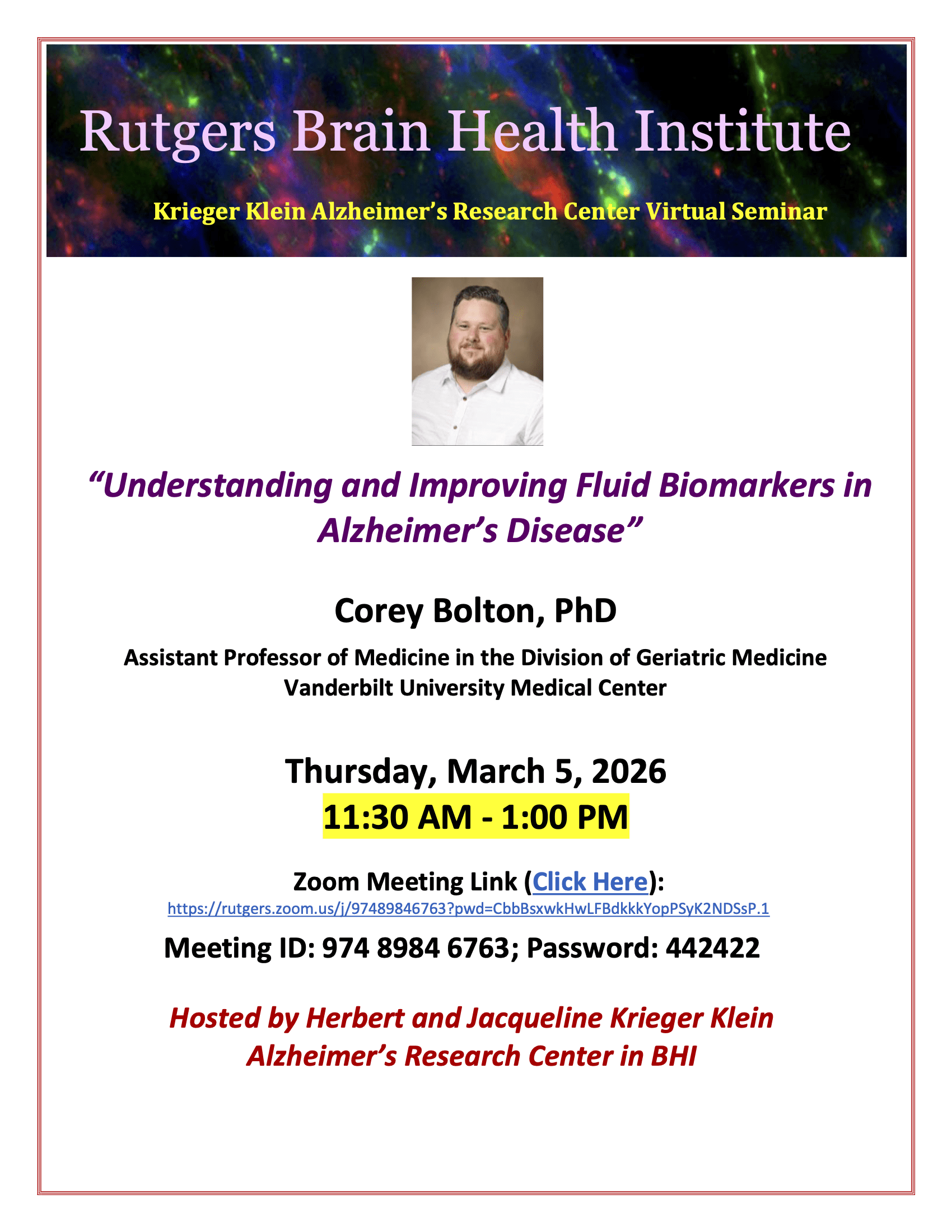 Krieger Klein Alzheimer’s Research Center Virtual Seminar: Corey Bolton, PhD