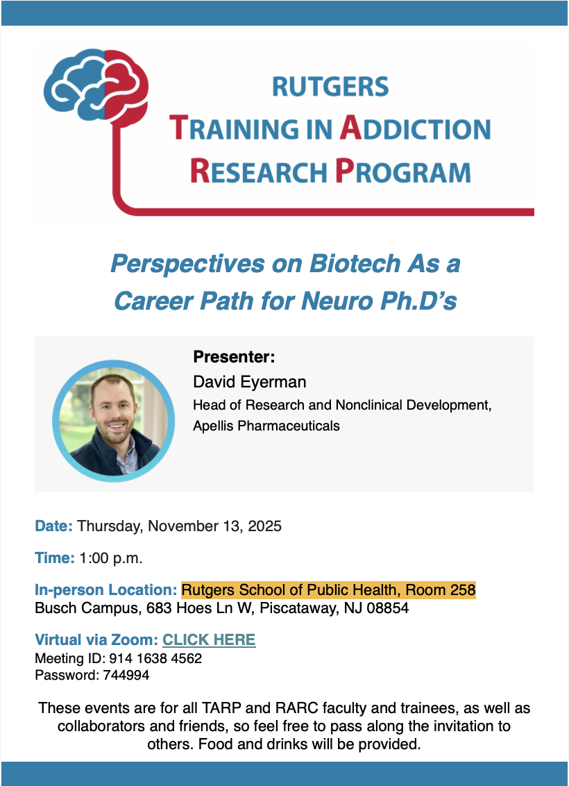 Join us for the Rutgers TARP Monthly Meeting on Thursday, November 13, at 1:00 PM in the RWJMS Research Building and School of Public Health (Room 258) in Piscataway and via Zoom. This month’s speaker is David Eyerman, Head of Research at Apellis Pharmaceuticals. All TARP and RARC faculty, trainees, and collaborators are welcome. Food and drinks provided.