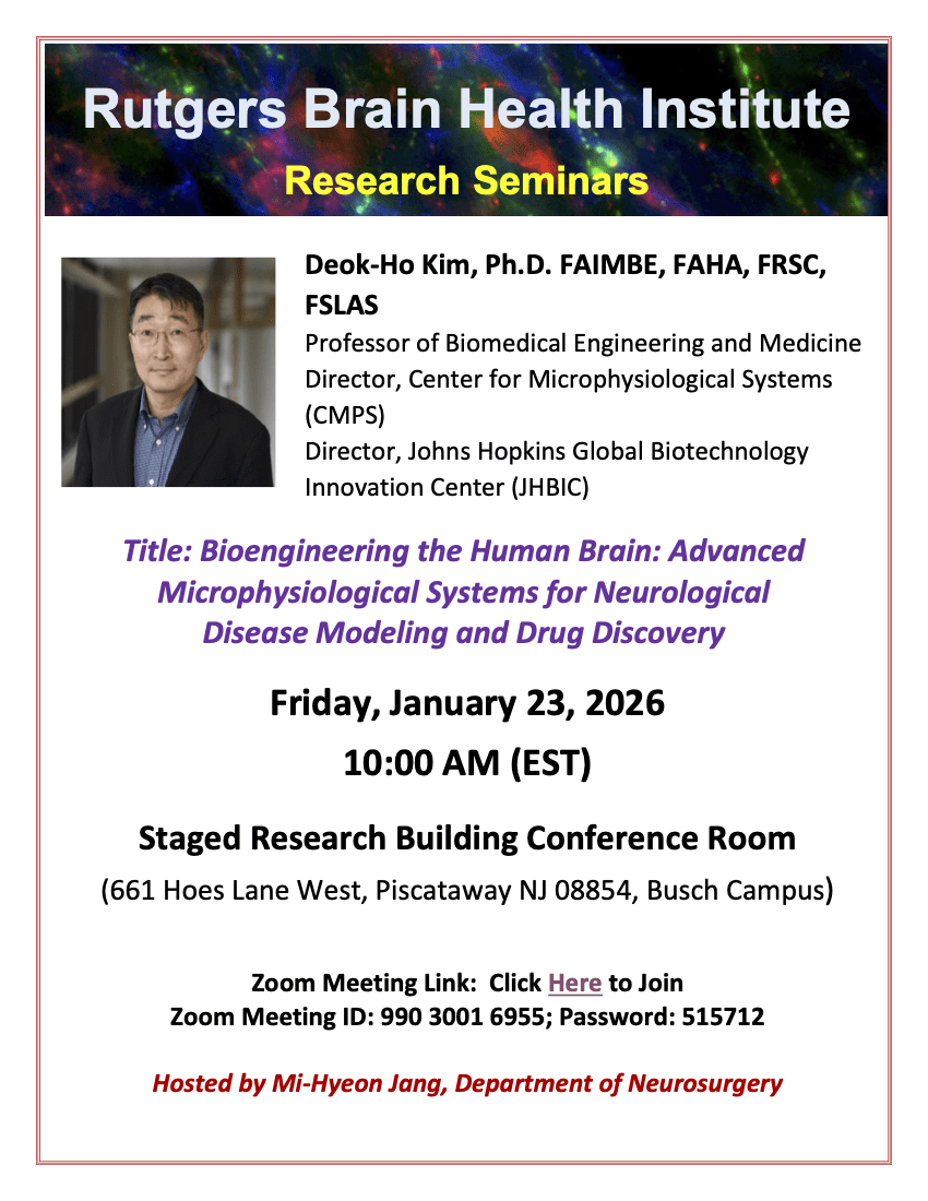“AI-Driven Innovations in Pain and Migraine: Bridging Neural Networks and Networked Patient Care” Speaker: Alexandre DaSilva, D.D.S., D.Med.Sc. Professor of Dentistry, Department of Biologic and Materials Science, School of Dentistry, and Professor of Learning Health Sciences, Medical School, University of Michigan Date and Time: Tuesday, February 24, 2026, 12:00 PM Zoom Meeting: https://rutgers.zoom.us/s/95917069637 Meeting ID: […]